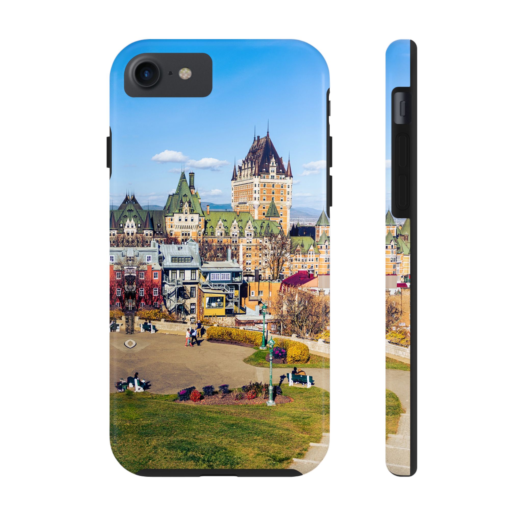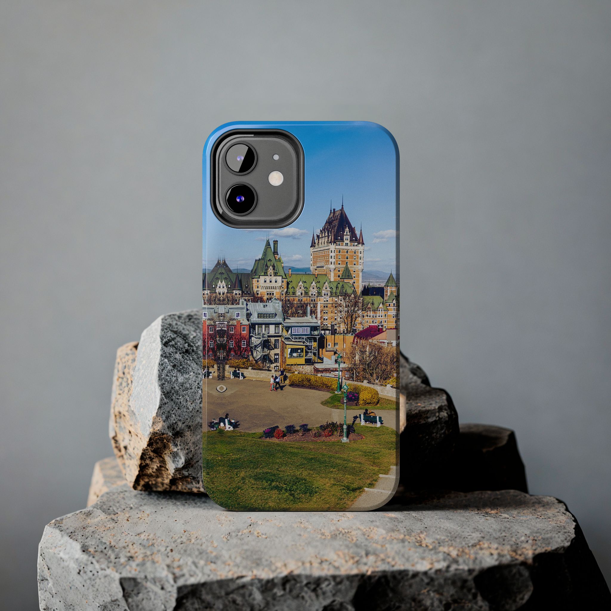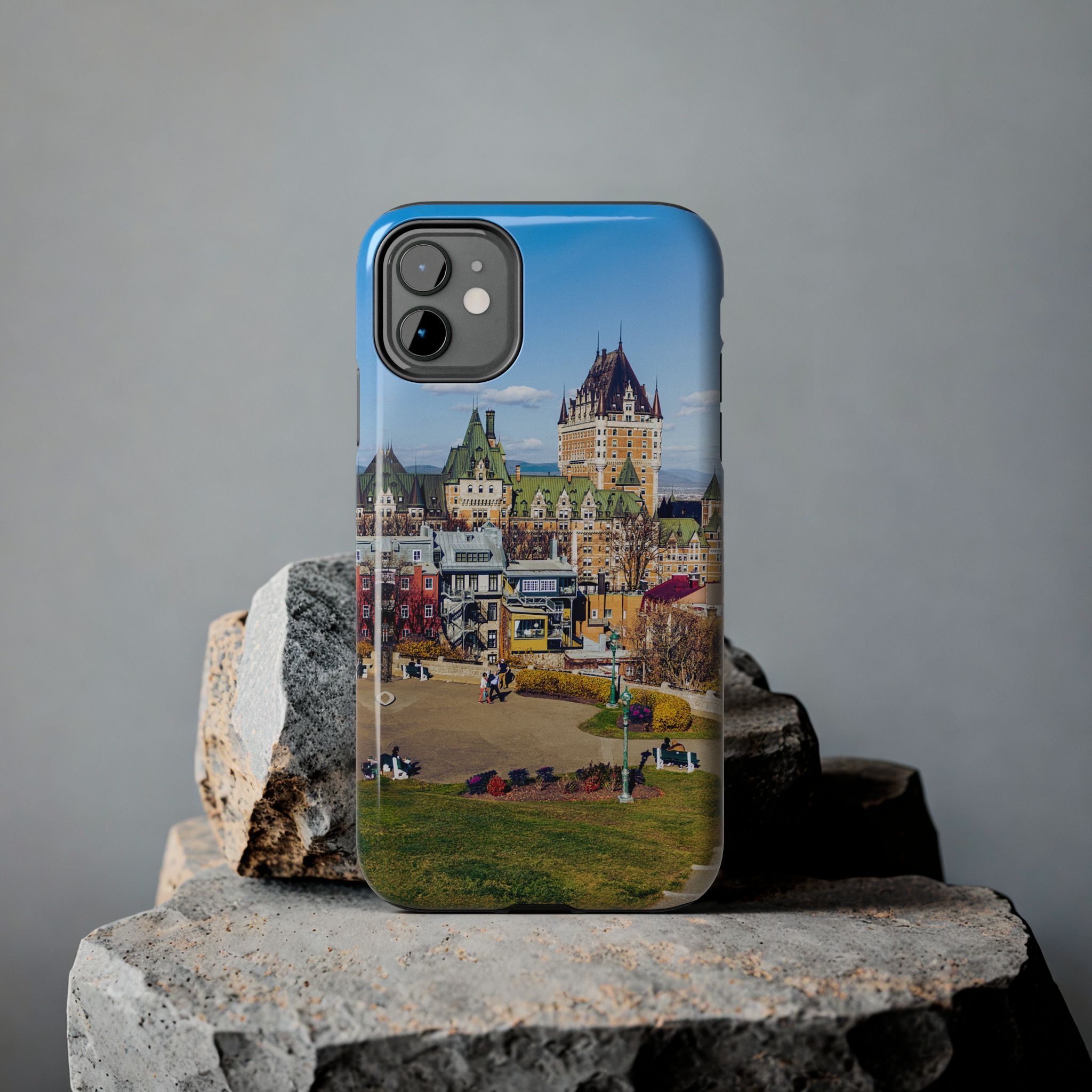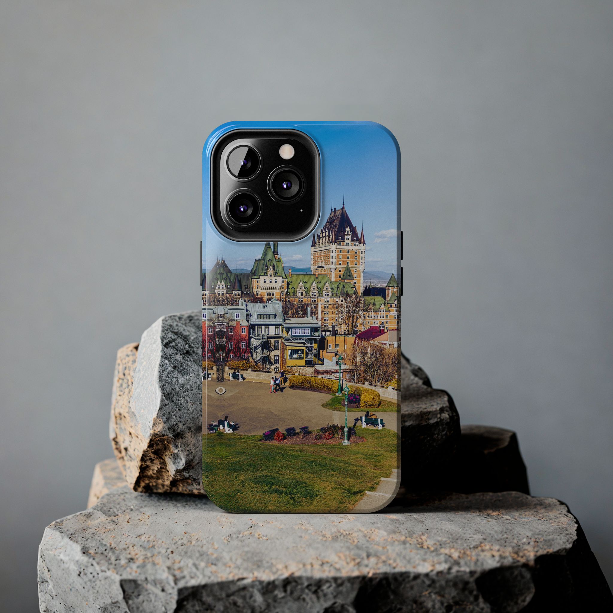 This tough iPhone case features a stunning aerial photograph of the iconic Château Frontenac in Old Quebec. Captured from above, this image showcases the historic charm and architectural beauty of one of Canada’s most famous landmarks. Designed for durability, this case offers robust protection for your phone against drops, bumps, and scratches. The dual-layer construction includes a hard outer shell and a soft inner lining, ensuring your device stays safe while looking stylish. Bring a piece of Old Quebec with you wherever you go with this unique and eye-catching iPhone case. Perfect for lovers of travel, history, and photography.