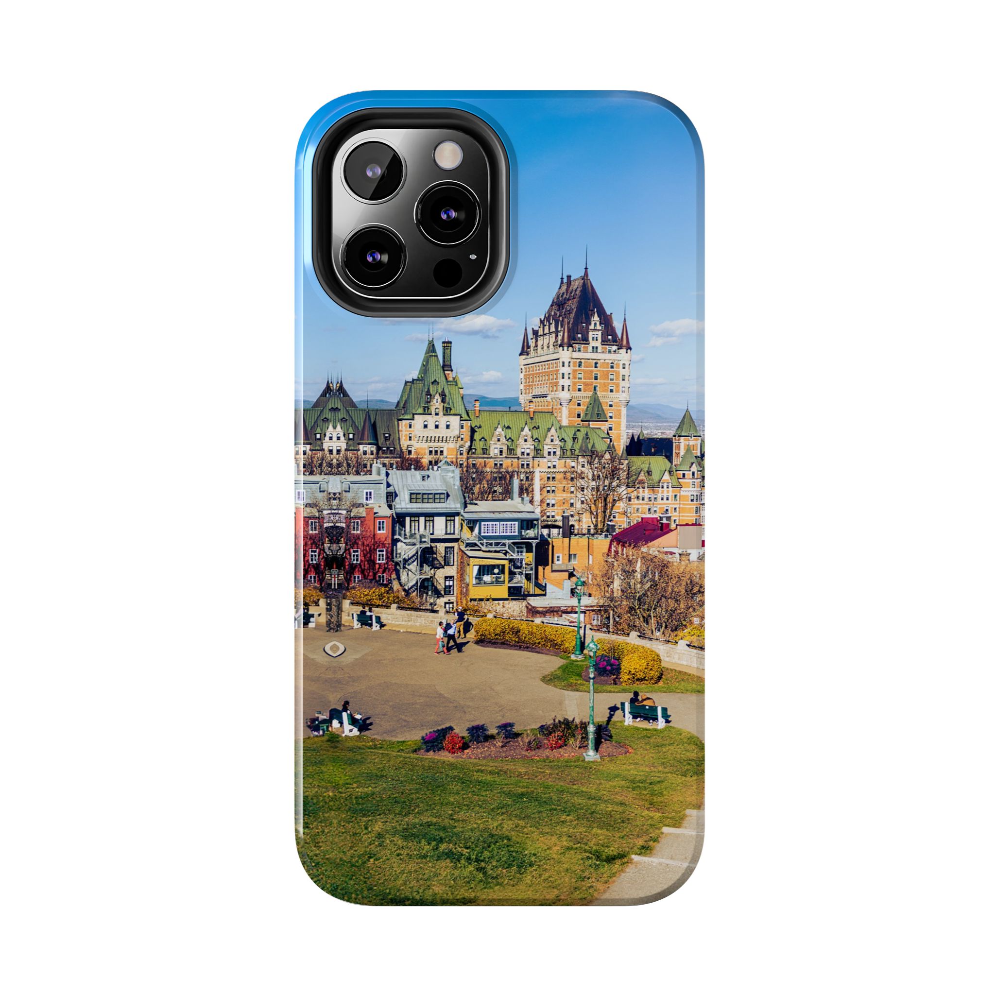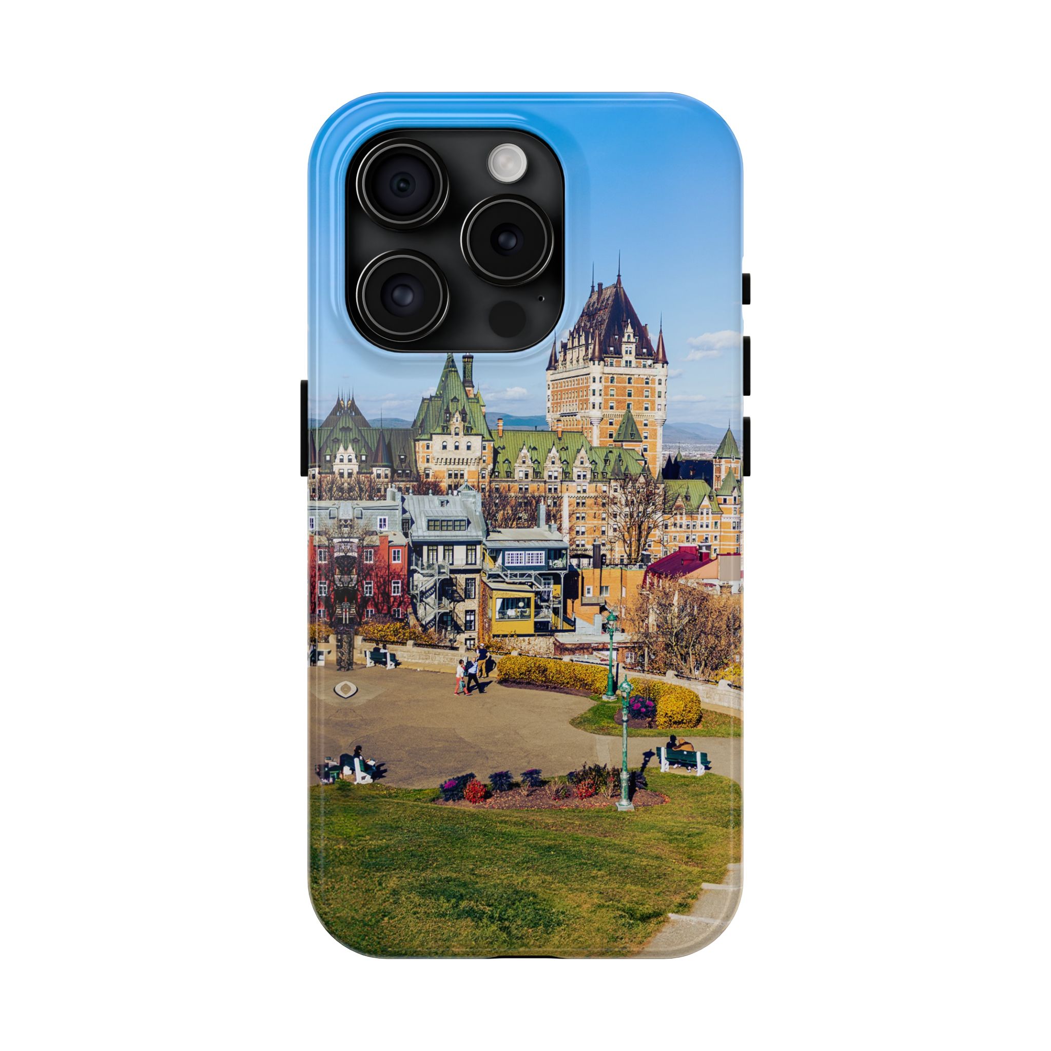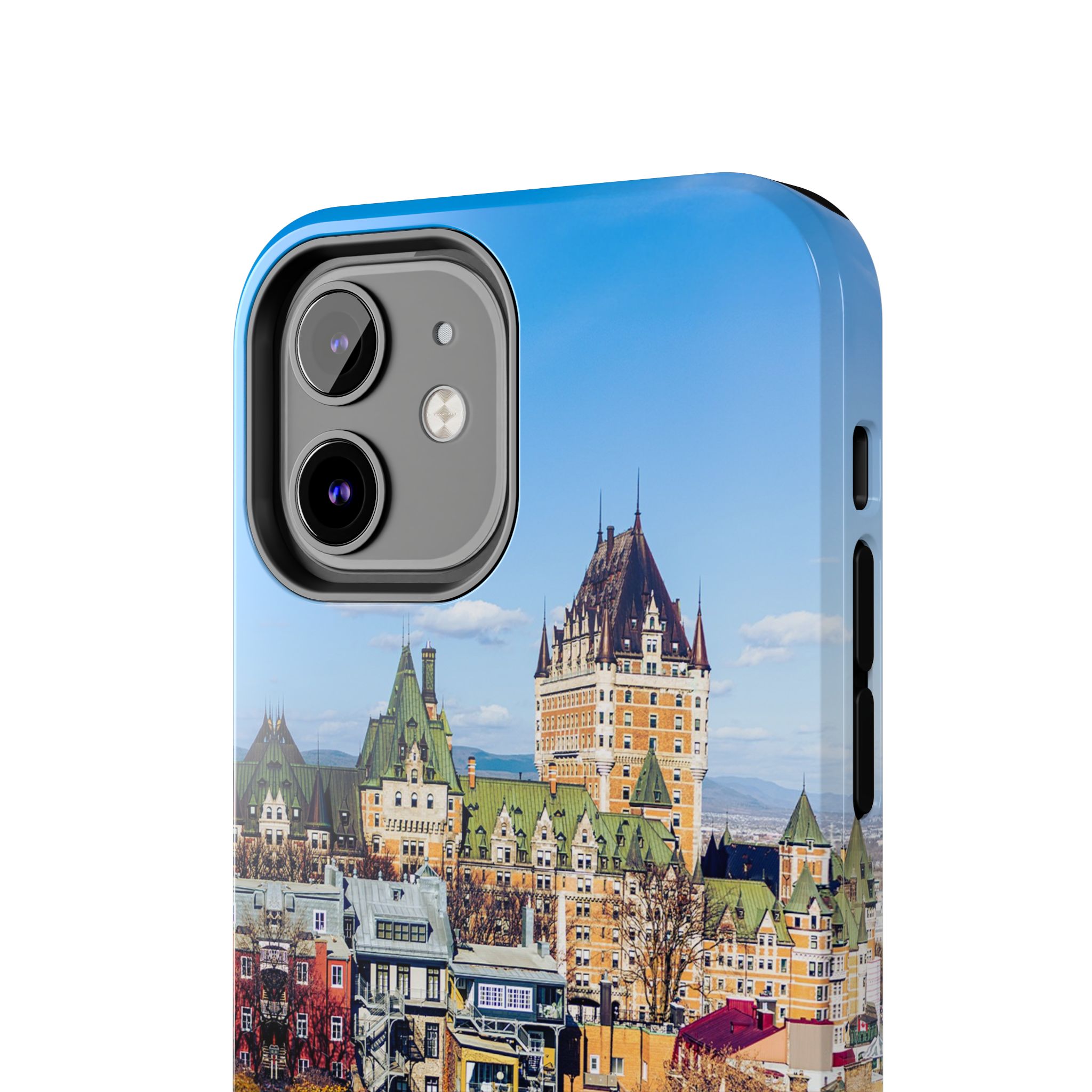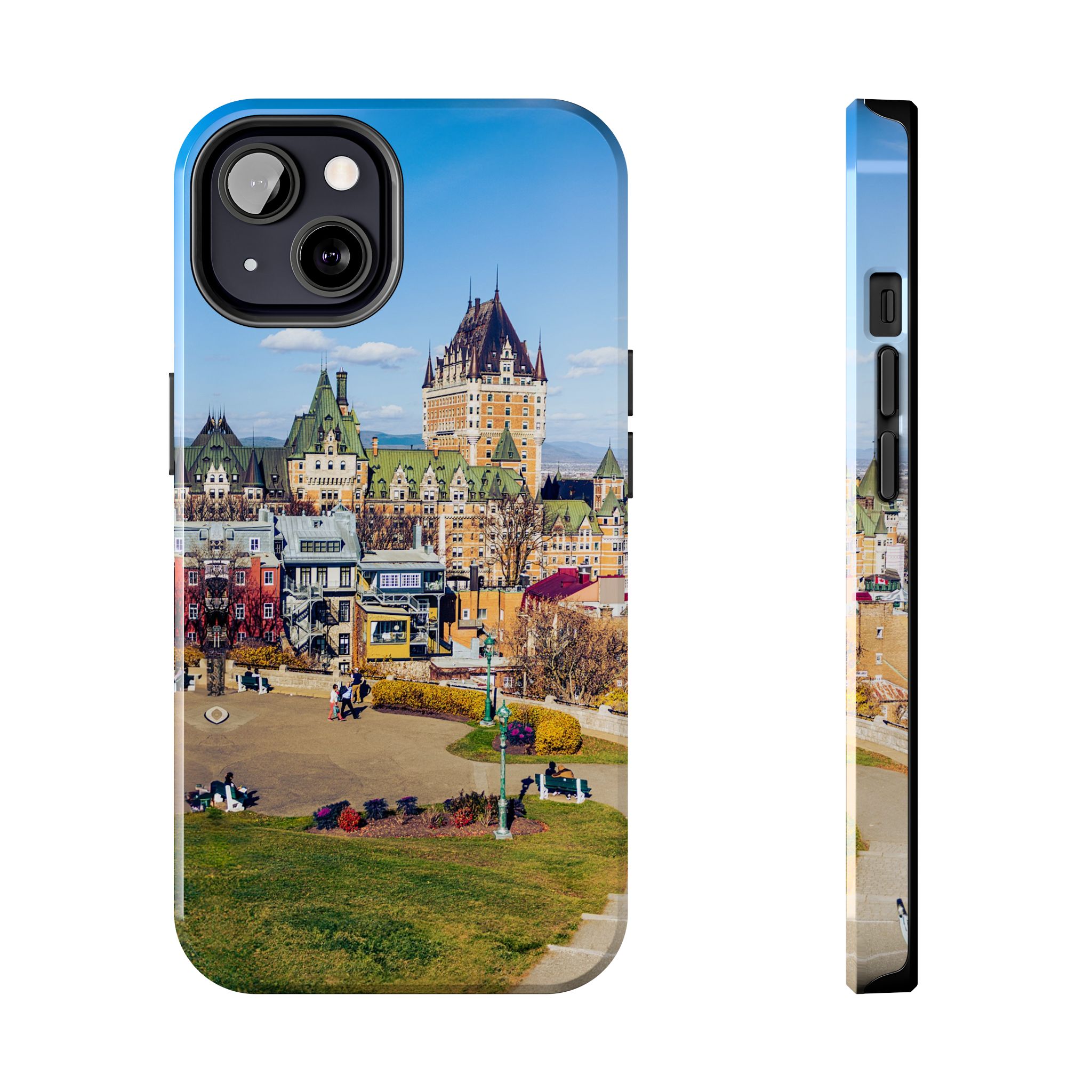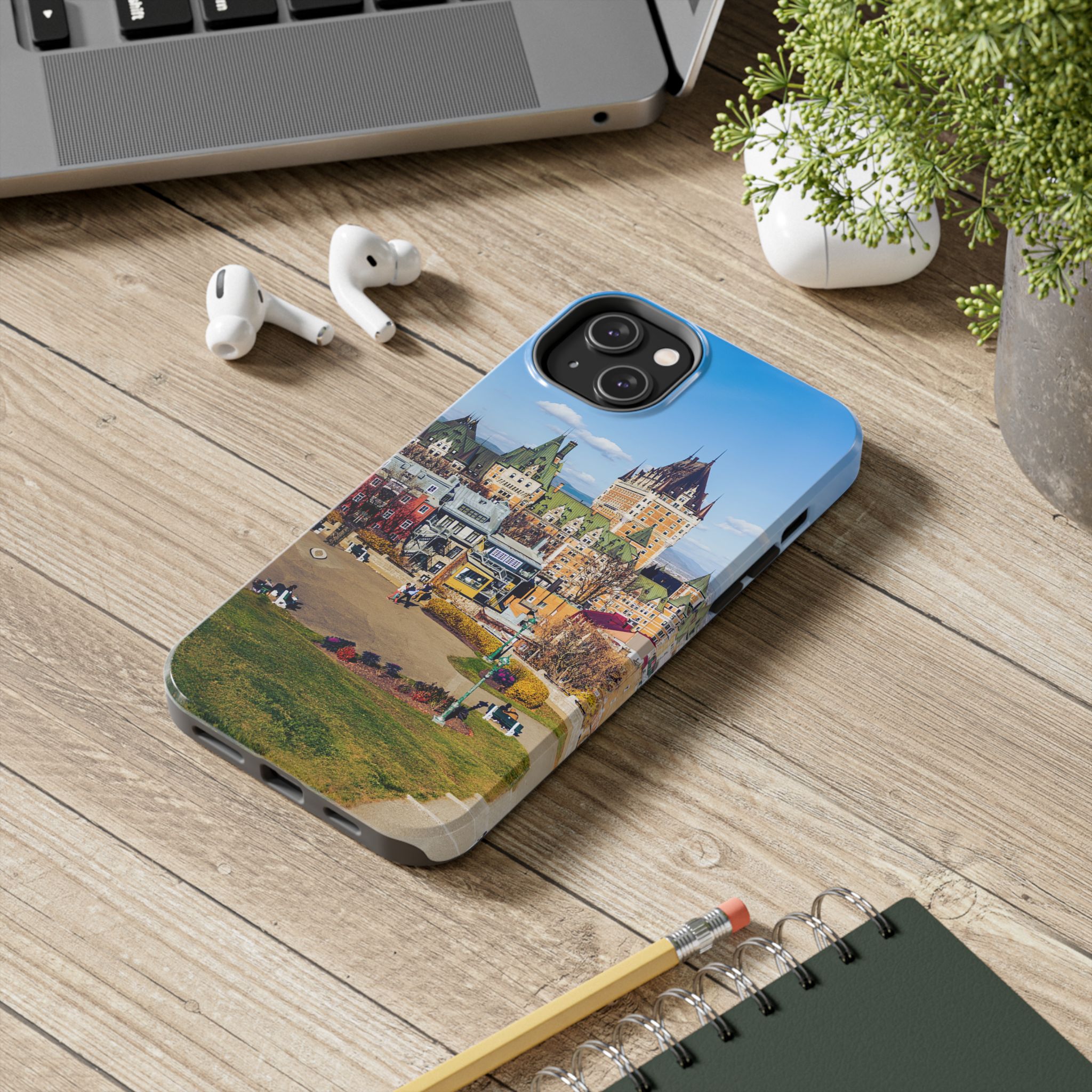 This tough iPhone case features a stunning aerial photograph of the iconic Château Frontenac in Old Quebec. Captured from above, this image showcases the historic charm and architectural beauty of one of Canada’s most famous landmarks. Designed for durability, this case offers robust protection for your phone against drops, bumps, and scratches. The dual-layer construction includes a hard outer shell and a soft inner lining, ensuring your device stays safe while looking stylish. Bring a piece of Old Quebec with you wherever you go with this unique and eye-catching iPhone case. Perfect for lovers of travel, history, and photography.