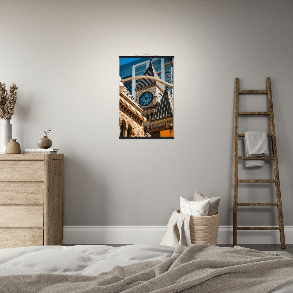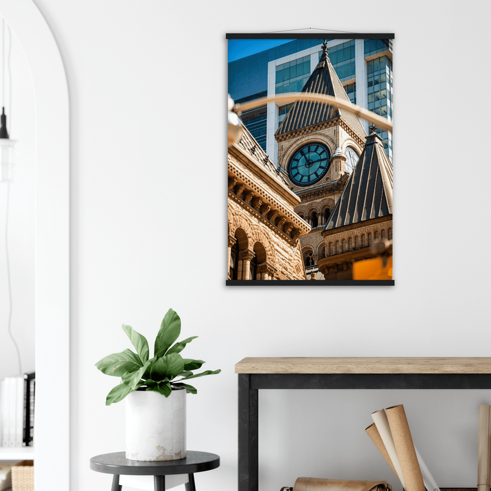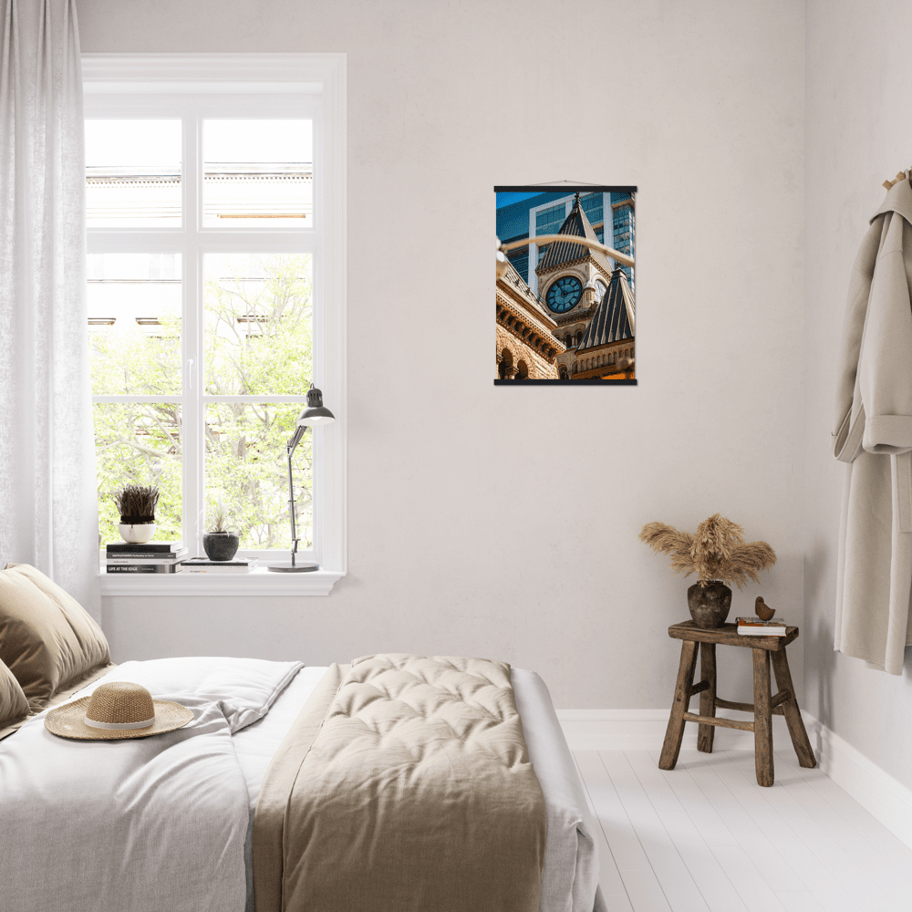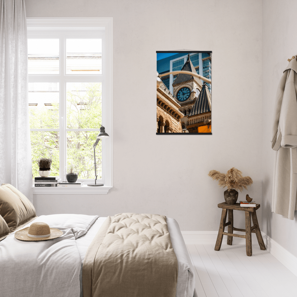 A high-quality poster and a beautiful hanger. Each hanger includes four wooden sticks, two that clamp the top of the print and two that clamp the bottom, and cotton ropes that match the hanger color. Strong magnets securely grip the artwork, while easily allowing you to change the art whenever is needed.